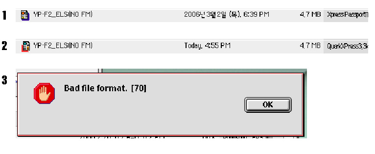 1바이트권 QuarkXPress 파일을 한국어판과 같은 2바이트권 QuarkXPress 프로그램에서 불러올 수 있지만 2바이트 포맷으로 변환이 필요하며, 저장을 하면 파일 포맷이 변경됩니다. 일단 파일 포맷이 변경되면 비가역적입니다. (되돌릴 수 없습니다.) 그냥 QuarkXPress 한글판을 이용해 계속 작업하거나 새로 만들어야 합니다.